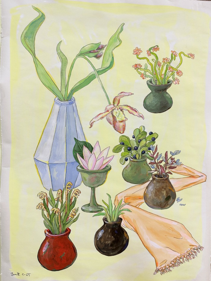Blumen mit Schal Bildnummer: 1-25Motivgruppe: StillebenTechnik: Acryl, Bleistift, DispersionTrägermaterial: PapierFormat: 69,5 × 49,5 cmFarbe: gelbEntstehungsjahr: 2025